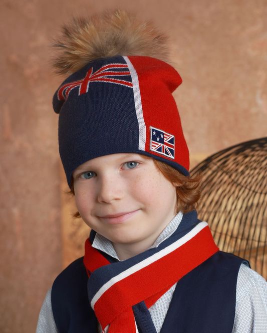 Шапка и шарф для мальчика «Тауэр» придадут образу юного джентльмена элегантность и шик. В основе дизайнерской концепции комплекта лежит изображение британского флага. Изюминка изделия — большой пушистый помпон, украшающий шапку на макушке.