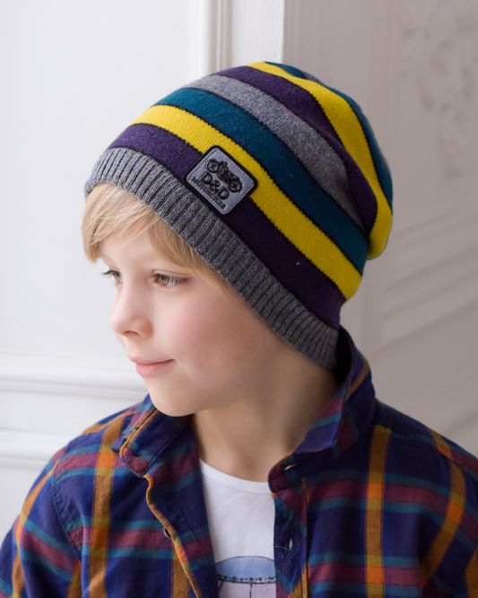 Теплая шапка на осень и весну в полоску: обратите внимание, какую богатую и яркую палитру создали дизайнеры! Благодаря оттенкам серого и синего модель отлично подойдет к любой верхней одежде, а цветные полосы поднимут настроение в самый хмурый день. Состав пряжи высокого качества — оптимален для демисезонных шапок: натуральная шерсть обеспечивает тепло, акрил не позволит шапке промокнуть, потерять форму и яркость цвета.