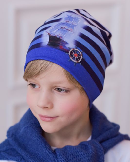 Шапочку украшает один из самых модных принтов сезона — контрастная полоска в сочетании с рисунками в морском стиле. Модель смотрится ярко, привлекает внимание, подходит к любой куртке, джемперу или толстовке.