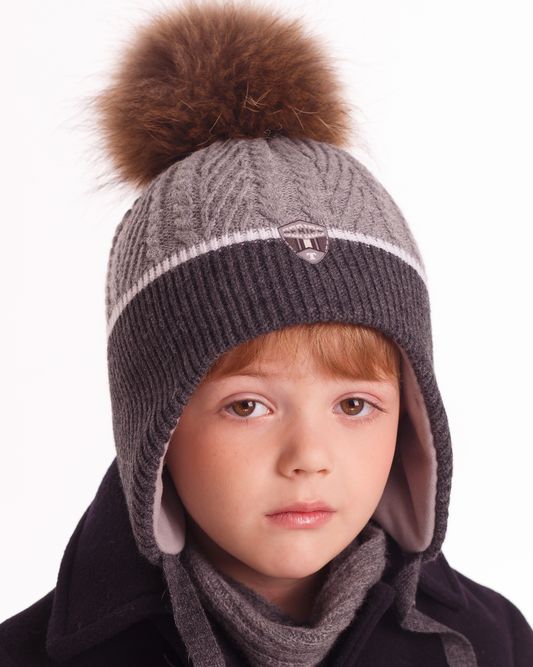 Эта шапка-ушанка украшена стильным узором вязки и объемным помпоном из натурального меха. Модель представлена в трех вариантах: эффектном сочетании