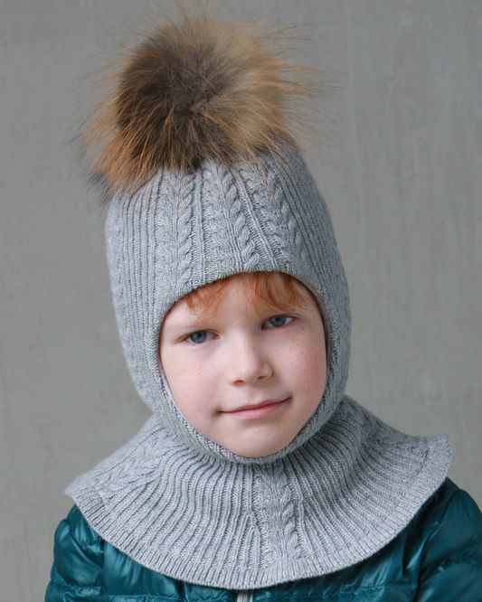 Простая, но элегантная вязка и сдержанные цветовые решения придают изделию нотки брутальности, что непременно будет оценено по достоинству юными представителями сильного пола. В то же время большой помпон из натурального меха на макушке подчеркивает детское очарование головного убора.