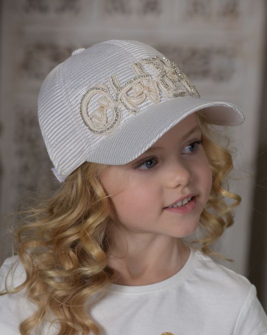 ткань с рельефной золотой полоской, объёмная вышивка - буквы с ювелирными камнями и бисером, жесткий козырек, регулируемая застежка для идеальной посадки