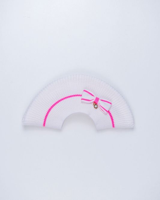 Головной убор связан объемной вязкой из смесовой пряжи, оптимально сочетающей в себе практичность акрила и теплоту натуральной шерсти. Небольшое сдержанное украшение в виде бантика выгодно подчеркивает простоту и изящество модели, представленной четырьмя цветами на выбор — белым, розовым,