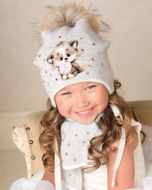 Этот комплект представлен в нескольких вариантах цветового оформления, для того чтобы каждая маленькая модница смогла выбрать подходящую гамму оттенков. Однако все они достаточно комбинаторны и легко вписываются в любой ансамбль. Изображение симпатичного котенка с розовым бантом на груди в окружении россыпи разноцветных стразов и большой меховой помпон на шапке делают изделие особо привлекательным.