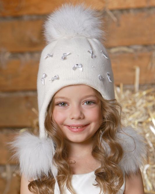 При создании этого головного убора дизайнеры стремились подчеркнуть нежную красоту, непосредственность и очарование юности. Неброский, выполненный с безупречным вкусом декор в виде маленьких бантиков из лент и стразов придает юной кокетке шарм. Белые помпоны из пушистого, словно воздушного, меха будут превосходно смотреться на фоне искристого снега.