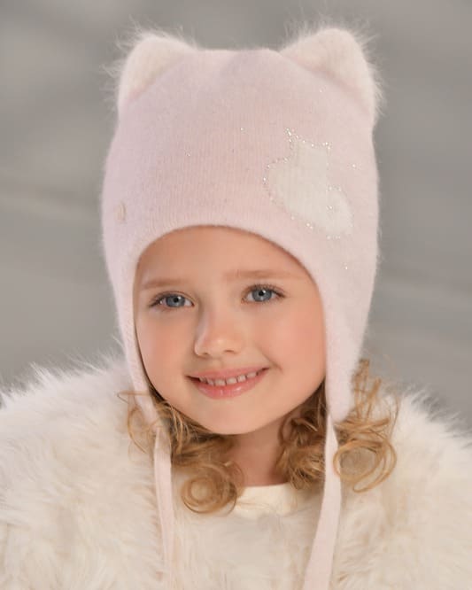 Шапка с жаккардом на подкладке с утеплителем, с мембраной на ушах и с завязками. Декорирована ушками, ювелирными стразами, перламутровым логотипом.