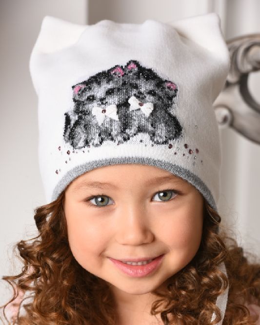 Крохотные веселые котята с белоснежными бантиками, нежно прильнувшие друг к другу, — изюминка дизайна этой вязаной весенней шапочки для девочки. Тема домашних животных, так любимая разработчиками детской одежды, обыграна здесь очень тонко и умело — эта живописная пушистая парочка, вызывающая умиление, непременно понравится и вашей кокетке.