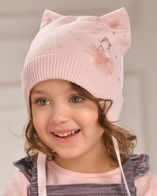 Шапка на завязках с декоративными ушками и небольшим отворотом для более плотного прилегания по голове. На ушках ювелирные броши бабочки. На шапке композиция из метал. и ювелирных страз. На отвороте метал. логотип.