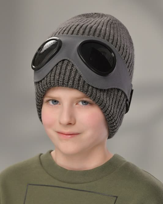 Шлем-шапка однослойный, декорирован очками на трикотажной основе, которые можно снимать, а нижний край шлема заворачивать в отворот и надевать как шапку.
