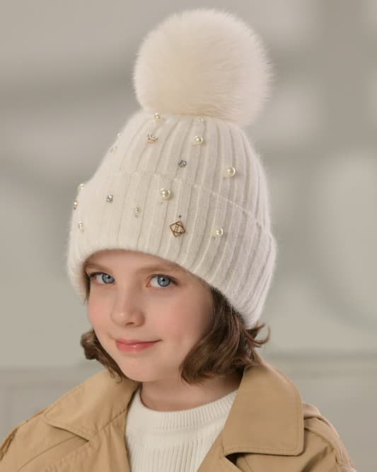 Шапка на подкладке с утеплителем, с отворотом и помпоном из натураного меха песца. Декорирована композицией из ювелирных страз, жемчуга, ювелирных камней, маленьких метал.брошек. Металлический логотип с ювелирными камнями.