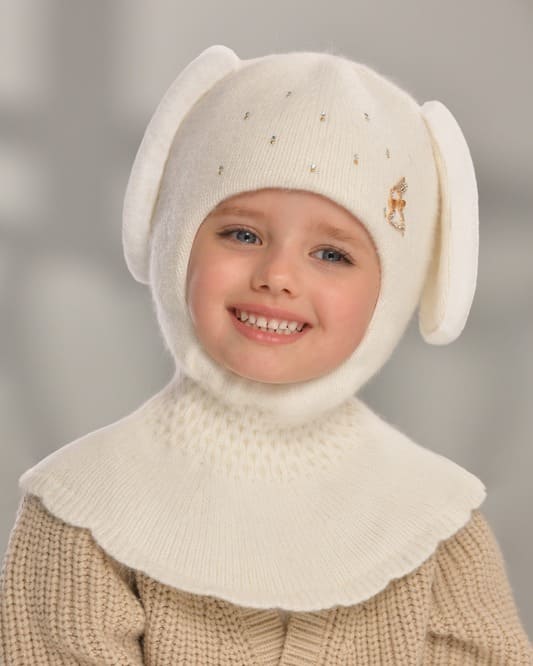 Шлем на подкладке с утеплителем, с мембраной на ушах. Декорирован ушками из искусственного меха, ювелирными стразами и брошкой.