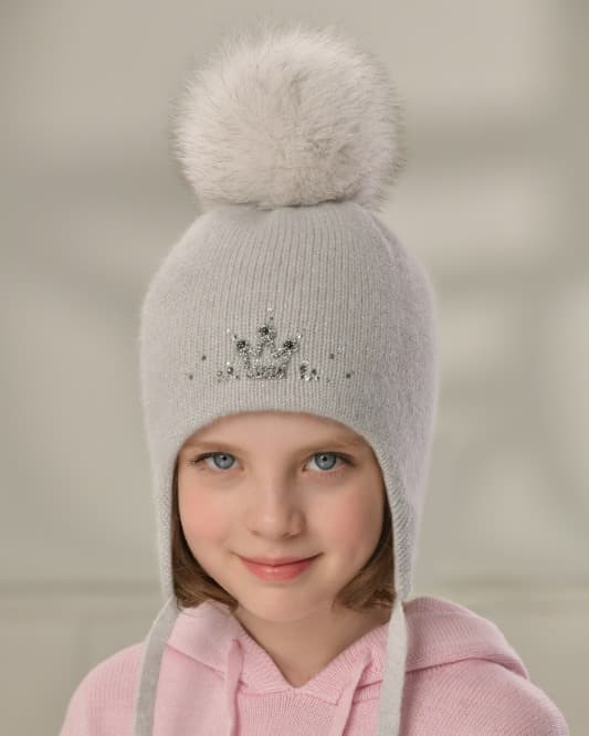 Шапка на подкладке с утеплителем, с мембраной на ушах, с помпоном из натурального меха песца, с завязками. Декорирована ювелирными стразами и декором в виде короны.