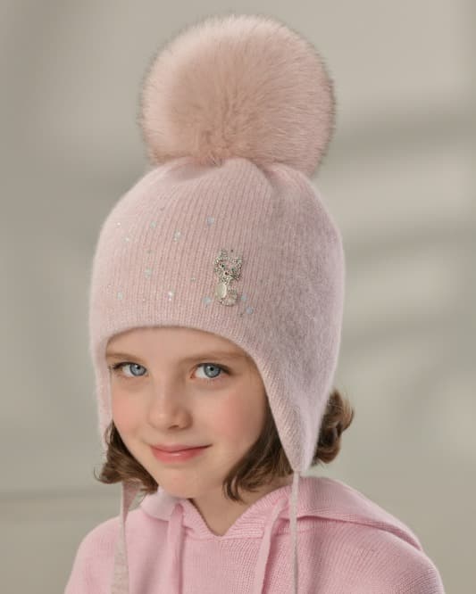 Шапка на трикотажной подкладке с утеплителем, с мембраной на ушах, с помпоном из натурального меха песца в цвет изделия, с завязками. Декорирована ювелирными стразами и ювелирной брошкой.