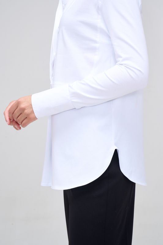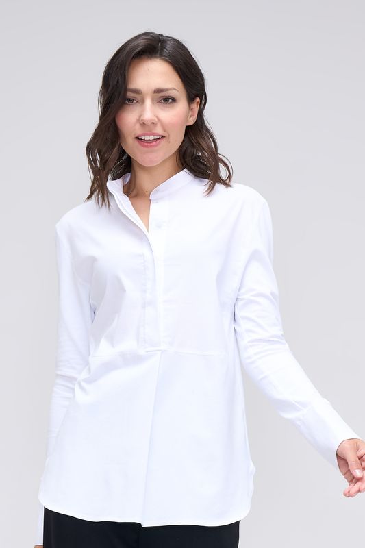 Белая блуза - женственный вариант рубашки полуприлегающего силуэта, с длинным рукавом. Воротник стойка. Пуговицы под планкой. Актуальный тренд на все сезоны. Подходит для любого стиля, будь то классика, романтика, спорт, офис или шик.