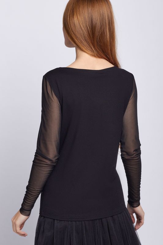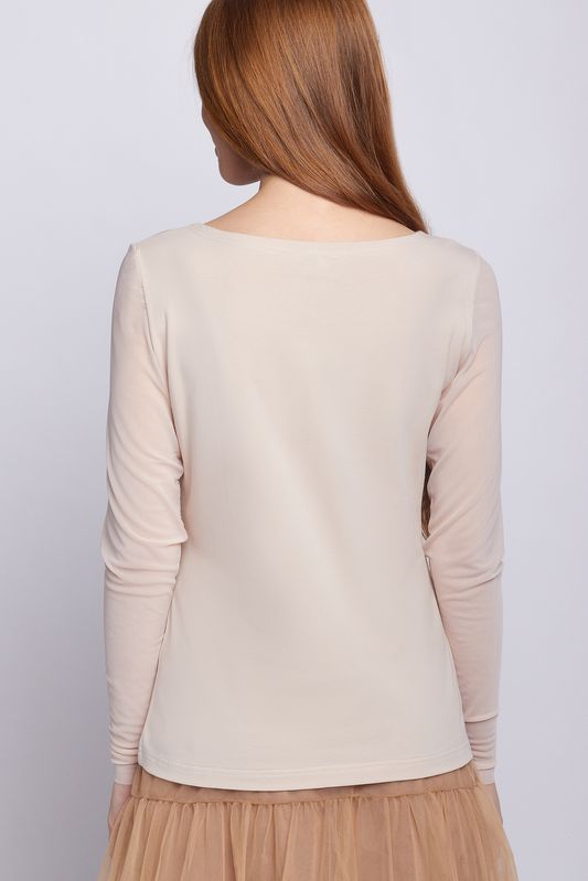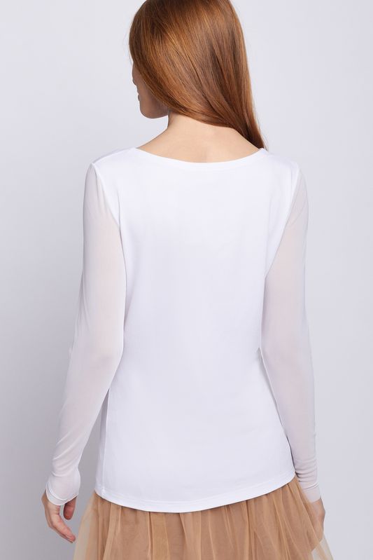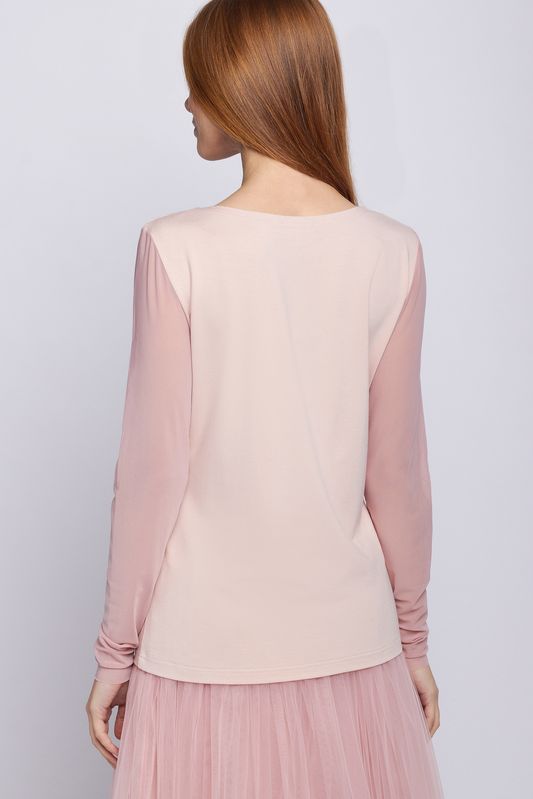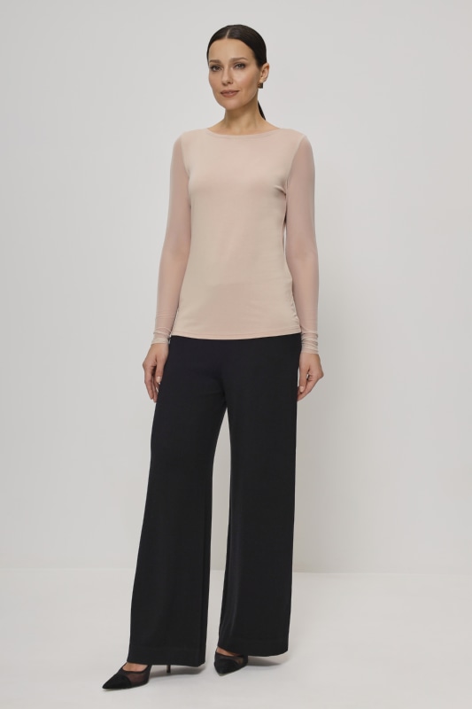 Джемпер трикотажный из вискозы, приталенного силуэта "песочные часы". Горловина выполнена в форме "лодочка". Рукав - нежная, прозрачная сетка, благодаря чему, изделие можно носить и с пиджаком, и с жакетом, и с рубашкой свободного кроя. Этот джемпер - не только идеальный вариант под любое трикотажное изделие нашей коллекции, но и прекрасно смотрится как самостоятельный вариант с юбками и брюками, акцентируя внимание на силуэте.