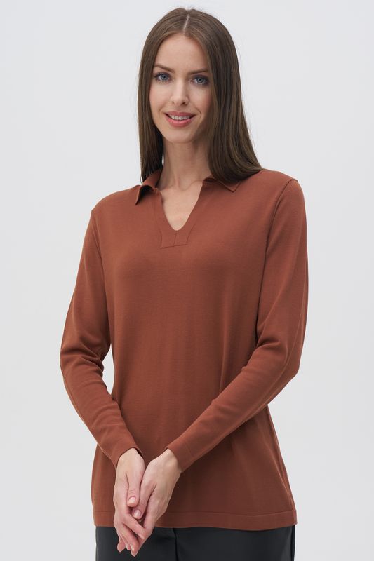 Джемпер женский прямого силуэта с втачным рукавом. Вырез горловины V-образный, воротник отложной. Джемпер универсален. с ним можно создавать любые образы.