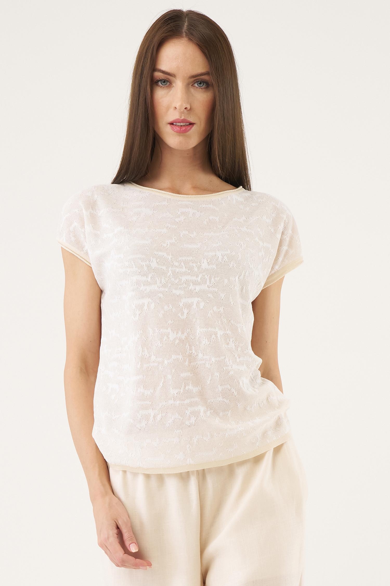Джемпер прямого, свободного силуэта со спущенным плечом, без рукава. Можно носить как самостоятельное изделие или комплектовать жакетом арт.2522, придавая гармоничность образу. Абстрактный графический рисунок выглядит рельефным и неравномерным из-за особого переплетения нитей. Джемпер связан из нежной вискозы, свойства которой хорошо пропускают воздух. Поэтому даже в самую жаркую погоду сохранится ощущение комфорта. Фирменная техника вязания позволяет изделиям надолго сохранять свою форму. Джемпер прекрасно сочетается как с юбками, так и с брюками различного фасона. Отлично будет смотреться с шортами, которые также есть и в нашей коллекции лето 2025.