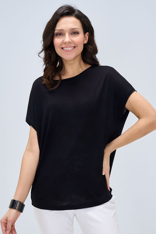 Футболка женская прямого силуэта с небольшим спущенным рукавом. Изготовлена из вискозного полотна, главным свойством которого является воздухопроницаемость. Благодаря этому свойству, а также свободному крою в футболке будет комфортно и в жаркий сезон, и в теплом помещении. В более прохладное время года можно носить с джемперами и жакетами.