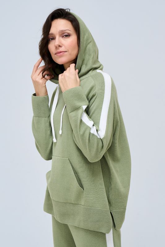 Свитшот прямого силуэта, низ манжетой без утяжки и небольшими боковыми разрезами. Капюшон на завязках. Карман-кенгуру служит не только в качестве декоративного элемента, но и предназанчен для комфортного размещения обеих рук в нем. Рукава-реглан отделаны широкими лампасами и широкой манжетой. Комфортно и стильно - залог хорошего настроения!