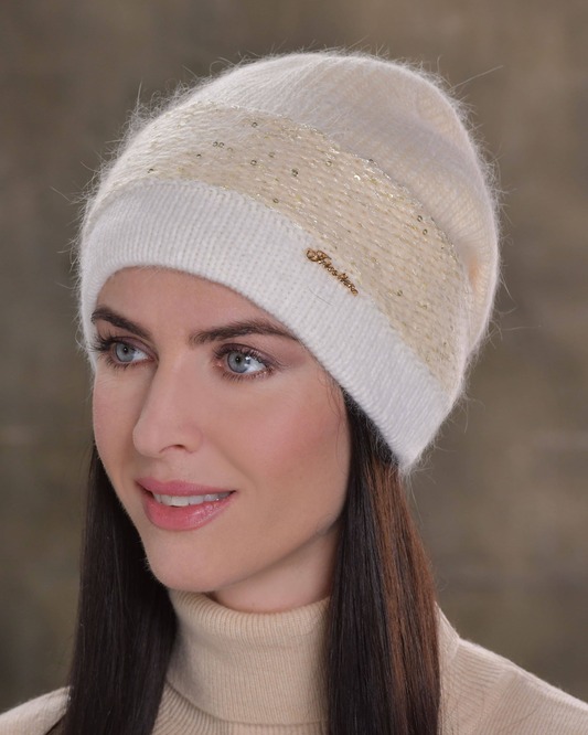 шапка двухслойная с закрепкой сзади для придания формы изделию, декорирована делой полосой к лицу, пайетками, металлическим лейблом