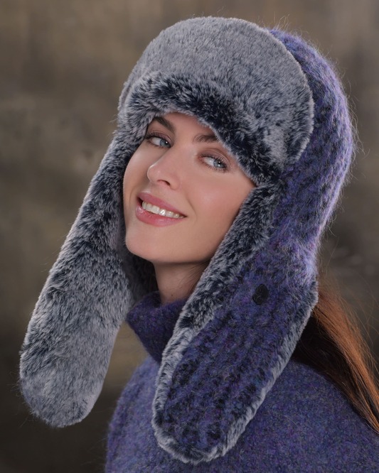 ушанка объёмной вязки с утеплителем, с длинными ушками, которые можно застёгивать на пуговицы, декорирована искусственным мехом