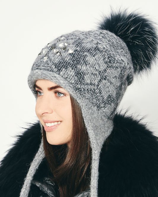 ушанка двуслойная на подкладке, декорироваао жаккардом и композицией из ювелирных камней, помпоны енот натуральный или крашеный